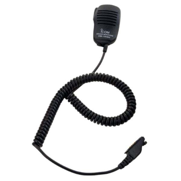 Icom light duty speaker mic with earphone jack and revolving belt clip.
