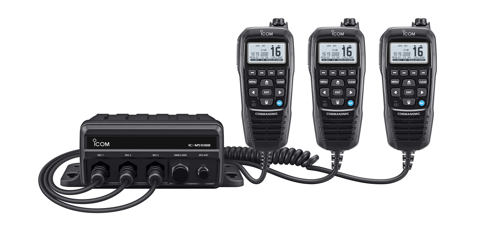 Up to three CommandMic™ stations are available with the IC-M510BB providing access to the VHF radio and Intercom functions. When using the Intercom function, you can select either one-to-all or one-to-one communication.