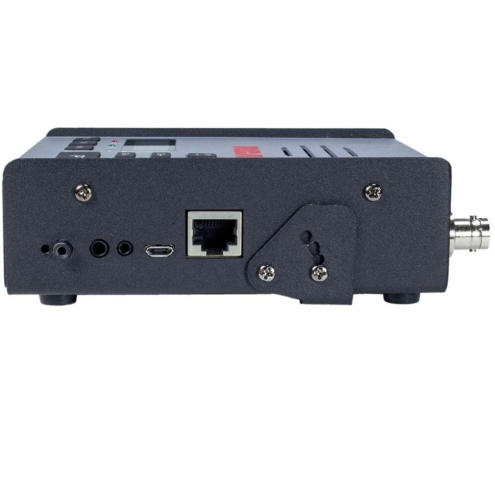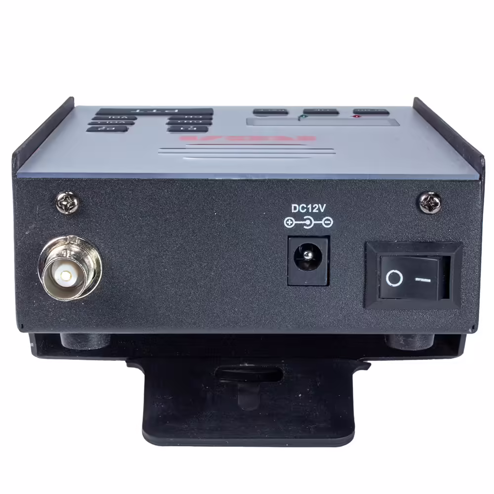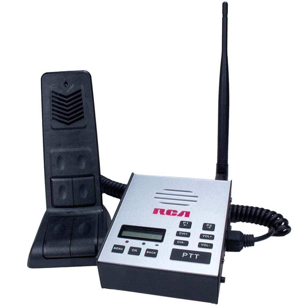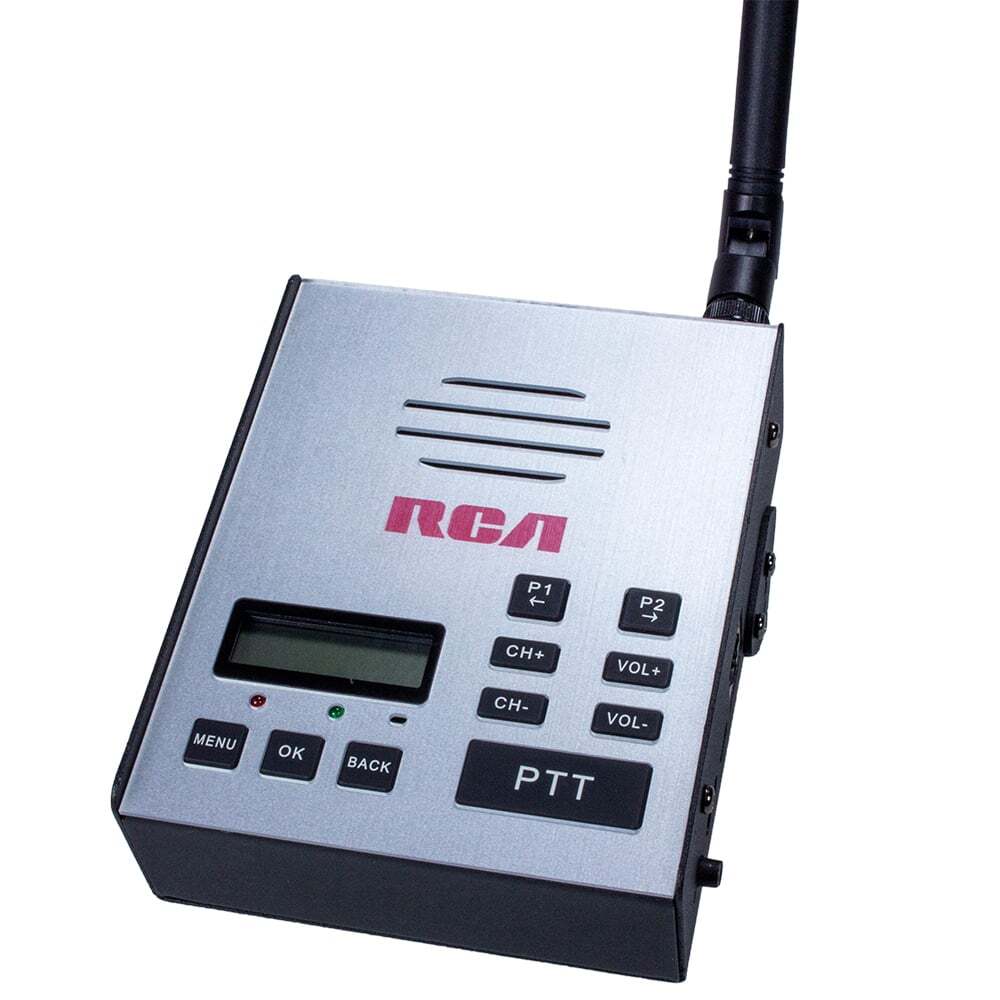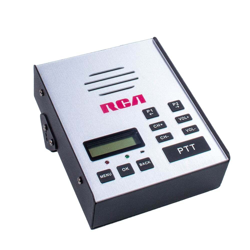 The RCA RDR2750 is a commercial grade two-way radio base station with durable metal housing, designed to sit on an office desk or be mounted to a wall or other flat surface. The base station comes equipped with a 16 character display, navigation buttons, programmable function buttons, built-in PTT or options for external desktop mic, palm mic, speaker mic or a headset.