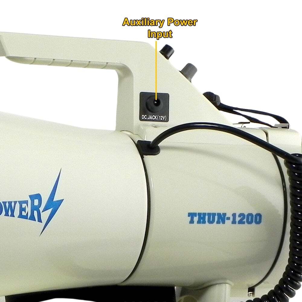 The THUN1200 has an auxiliary jack so you can easily plug in your MP3 player, microphone or other external audio source and crank up the sound to an “11”. Additionally, it includes a cigarette plug power supply so you can use it from a vehicle without worrying about batteries.