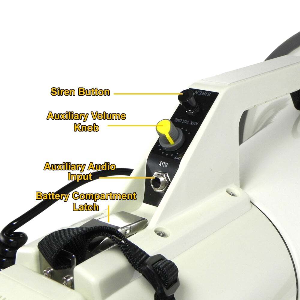 VOICE AMPLIFICATION AND PALM MIC: 45 Watts of power can amplify your voice up to 2000 yards, while the heavy-duty shoulder strap and detachable palm mic allows you to aim the 12” bell with pinpoint accuracy.