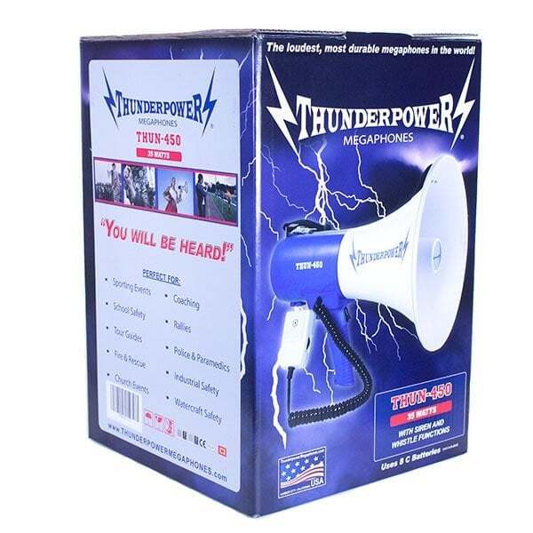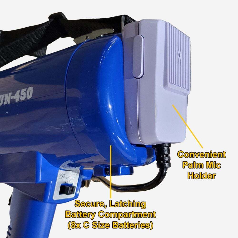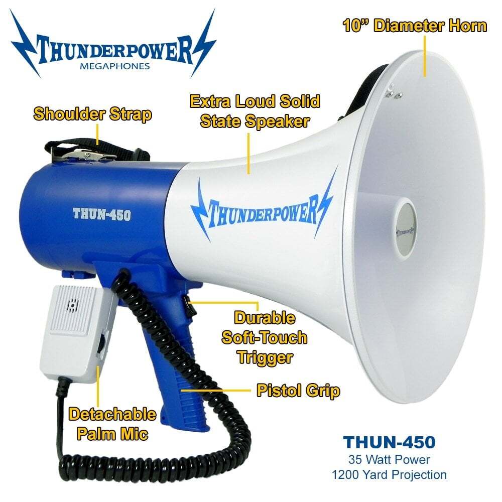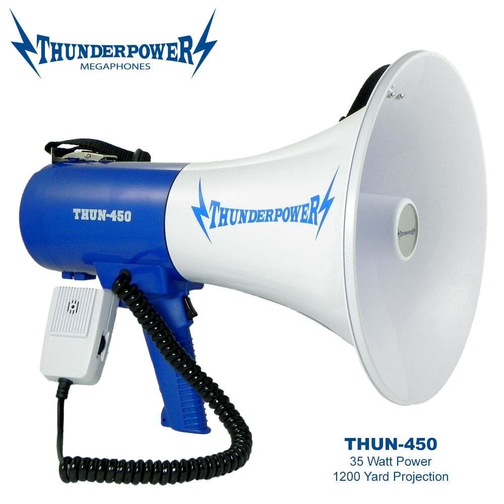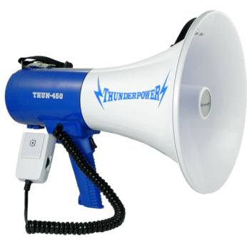 The ThunderPower 450 is an incredibly loud megaphone/bullhorn that stands out due to how easy it is to carry around with its shoulder strap and detachable palm mic. If you need to use your megaphone all day long and you need it to be LOUD then the ThunderPower 450 is the one for you!