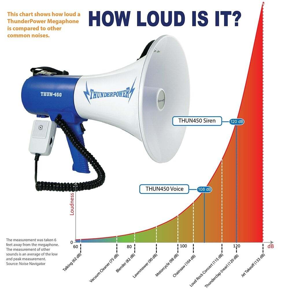 The THUN-450 can reach 120 decibels, or the equivalent to a loud clap of thunder.